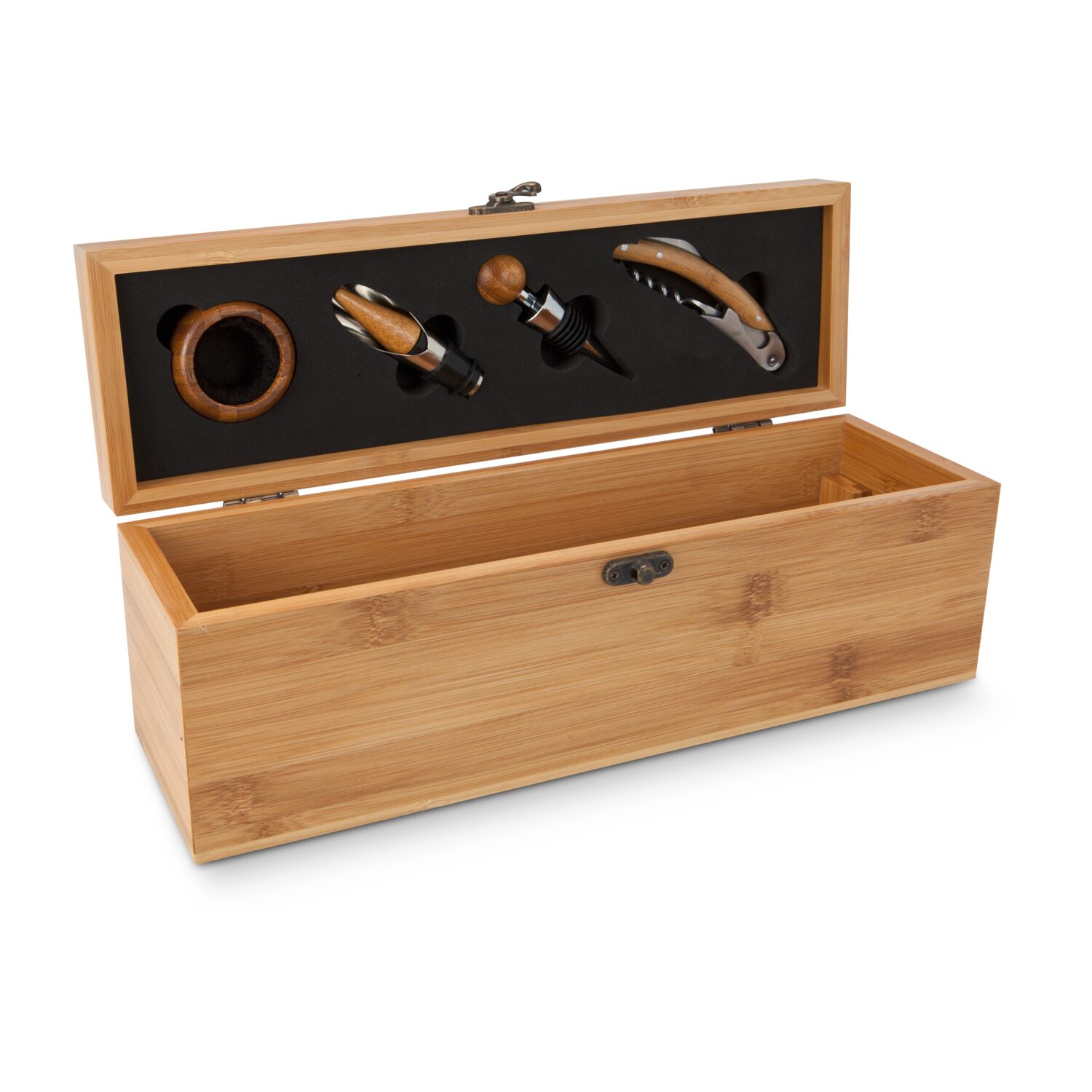 Eine hochwertige Bambuskiste mit edlen Weinaccessoires von ROMINOX® für einen guten Rotwein: Korkenzieher, Flaschenverschluss, Ausgießer und Tropfring, jeweils mit Bambuselementen. Dazu eine Flasche 0,75 l klassischer Cabernet Sauvignon mit hochwertiger Goldfolienprägung.